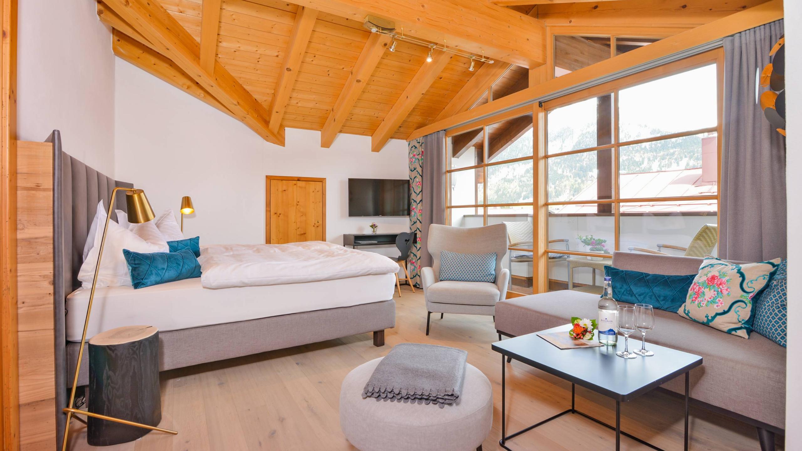 Eine geräumige Suite für besondere Urlaubswünsche: modern und gemütlich eingerichtet, mit großer Fensterfront und privater Loggia mit Blick auf den Sonnenaufgang über dem Nebelhorn – einfach wunderschön!